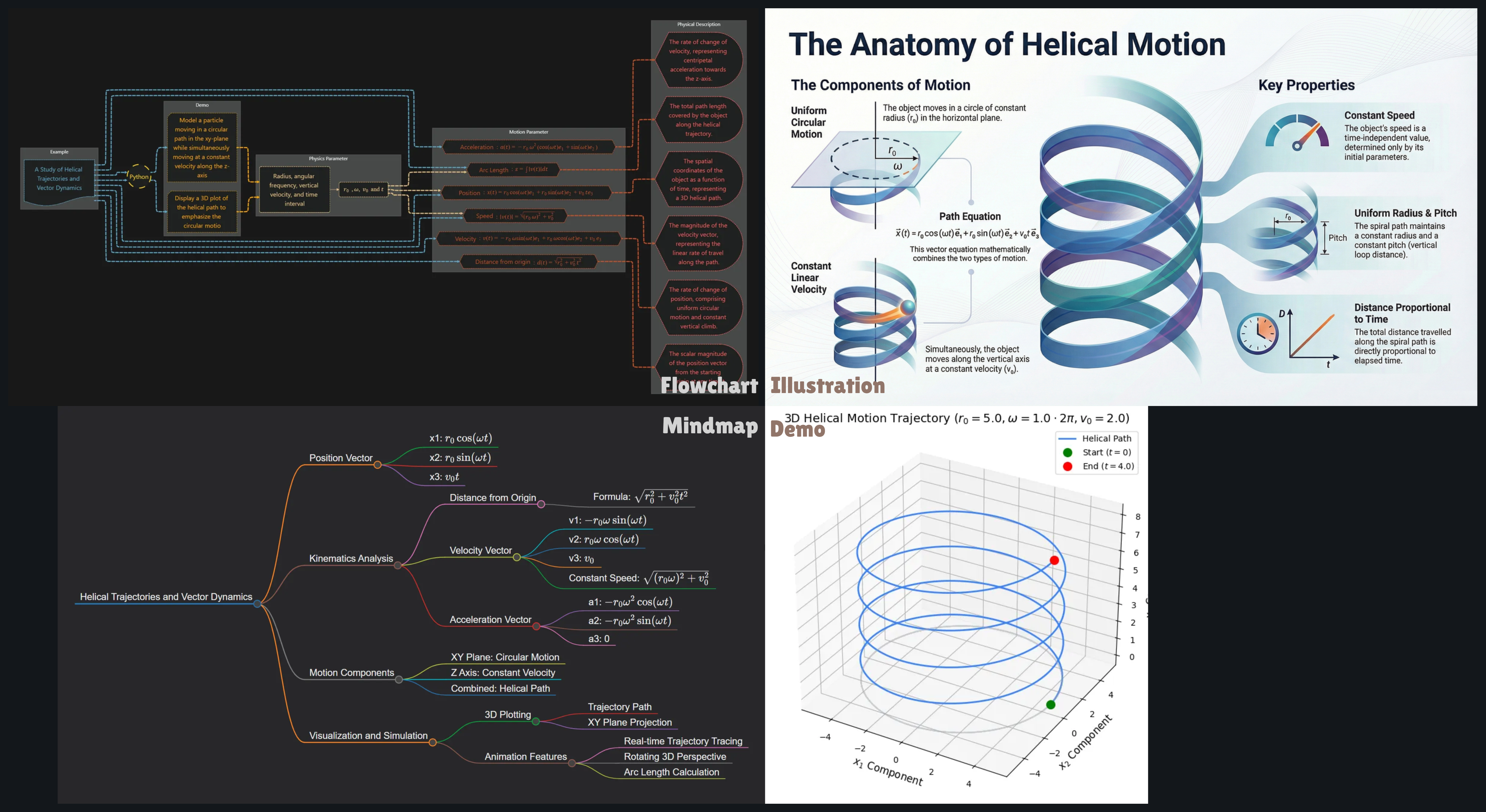 This collection of visual aids outlines the mathematical and physical framework of a 3D helical trajectory, which is formed by merging uniform circular motion in the $xy$-plane with constant linear velocity along the $$z$$-axis. The **flowchart** details the transition from initial physics parameters (radius, frequency, and velocity) through Python-based modeling to derive motion parameters like position, speed, and arc length. The **mind map** further deconstructs these kinematics into specific vector components, noting that while position and velocity vectors change, the speed remains constant due to the time-independent nature of the initial parameters. Finally, the **illustration** identifies the "anatomy" of this motion, emphasizing that the resulting spiral path maintains a uniform radius and pitch, with the total distance traveled being directly proportional to elapsed time.
